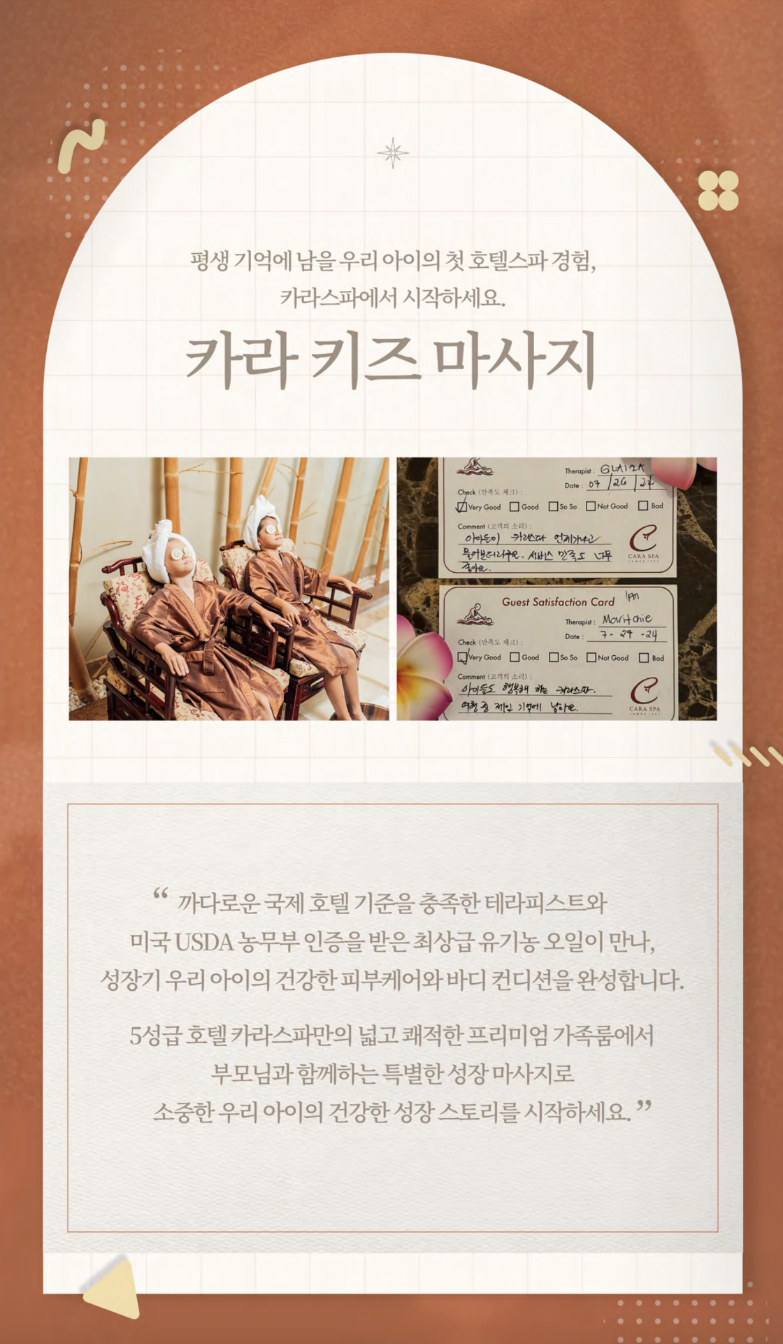 5성급 호텔 스파 안전한 환경에서 아이를 위한 전용 성장 마사지. USDA 유기농 코코넛 오일 사용. 부모 마사지와 동시에 진행할 수 있어 가족 여행에 최적입니다.