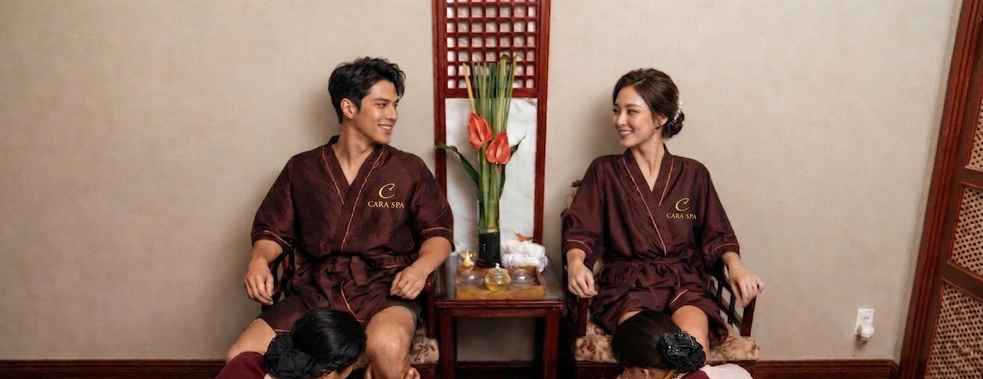 유기농 곡물 바디 스크럽(보습 케어) + 전신 마사지 + 얼굴 진정 케어까지 한 번에 담은 카라스파의 대표 풀코스. 프라이빗 커플룸에서 럭셔리한 호텔 스파를 처음 경험하고 싶은 분께 가장 먼저 추천합니다.